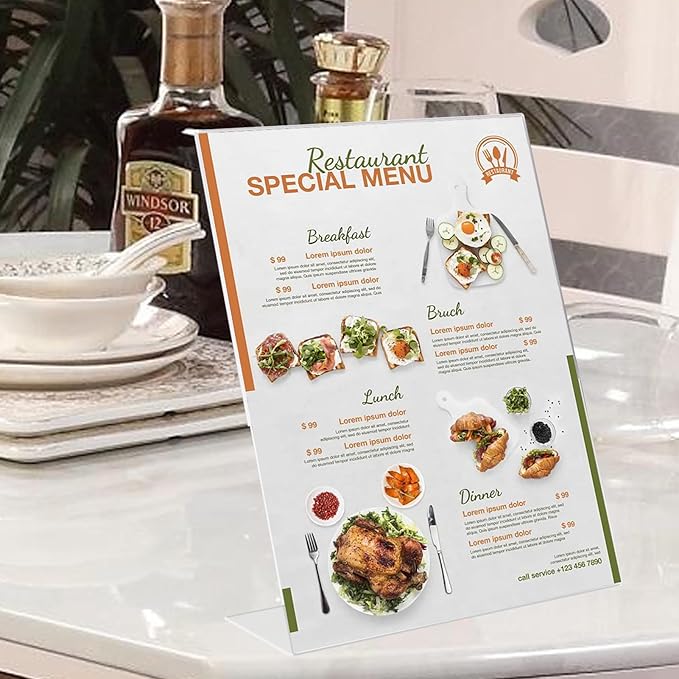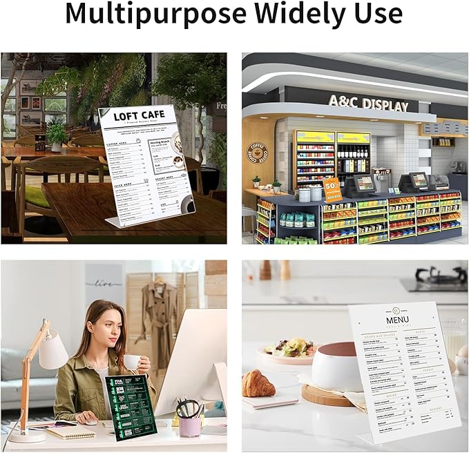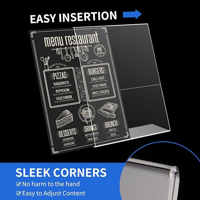 - Wide Application: Acrylic sign holder 8.5 x 11 is perfect for displaying advertisements, menus, flyers and brochures. It can be used in offices, stores, hotels, restaurants, trade shows, anywhere you want to use it. Acrylic sign holder 8.5 x 11 helps you spread information by making it accessible to everyone.
