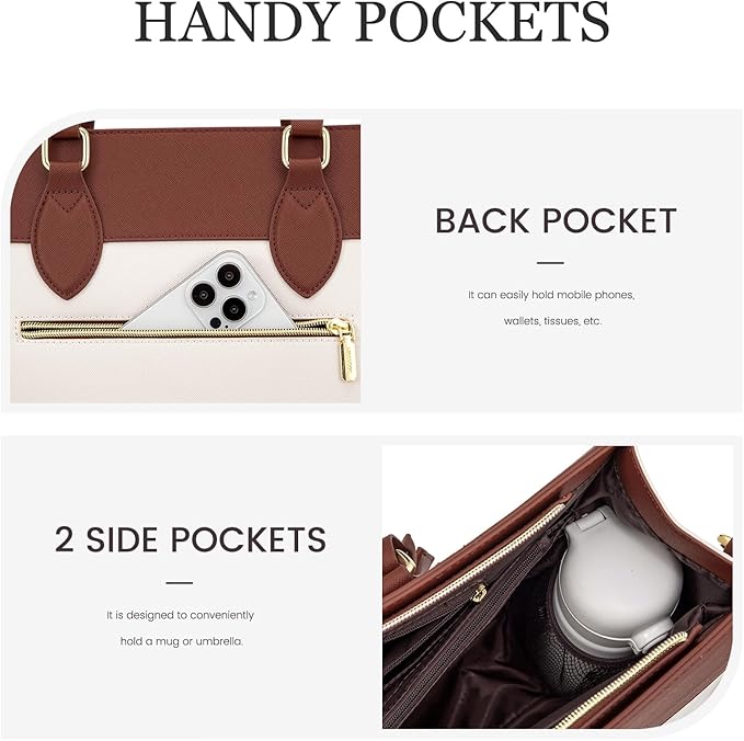 - 【Multi-pocket Handbag】 The main compartment incorporates various pockets for organized storage, including a laptop compartment, tablet compartment, large zipper pocket, two open pockets, a small zipper pocket, two pen slots. Each pocket is strategically placed for easy access and efficient organization