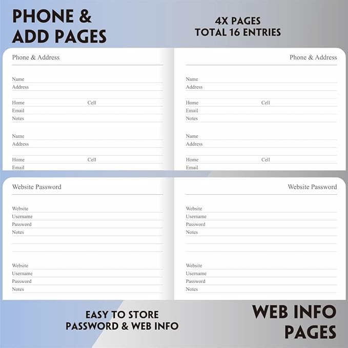- Major holidays listed, important date pages, 4 password, address and expense pages, and 11 notes pages