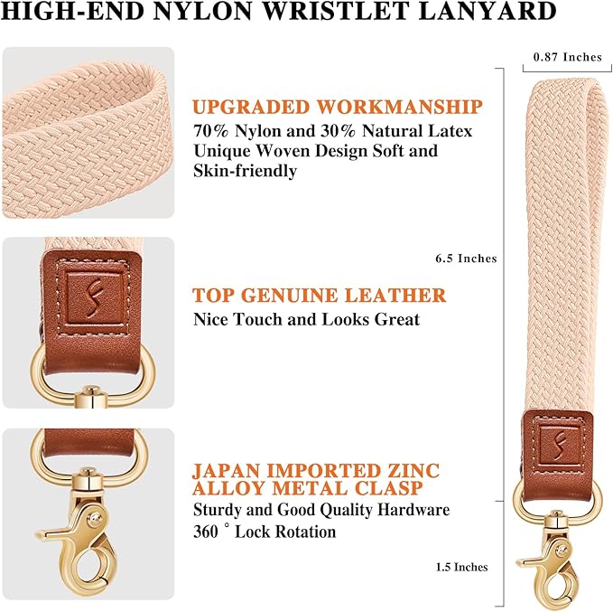 - Upgraded Stretchy Design: Fishent wrist lanyard is roughly 0.87 inches width and 6.5 inches length from the bottom of the leather to the top of the wrist key loop, with super-soft weave strap(stretchy), genuine leather and quality metal wristband keyring clasp lanyards for keys. The hand wrist lanyards keychain adopt unique upgraded stretchy nylon design, the wrist strap is soft and textured. Comfortable to wear and not easily deformed.