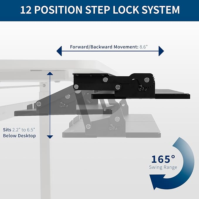 - Height Adjustment - Adjust the distance between your tray and the desktop (2.2” to 6.5”) with the simple 12-step locking system. This encourages ergonomic posture and accommodates thicker table tops.
