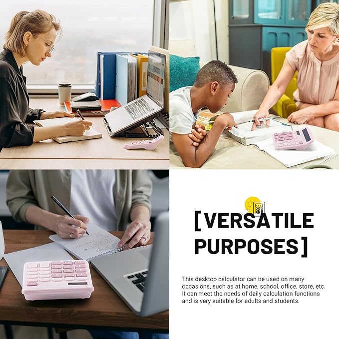 - [PINK CALCULATOR] This desk pink calculator has a large 12-digit display, large buttons, dual power supplies (solar and battery), and a tilted head design for easy use, making your work easy and enjoyable.