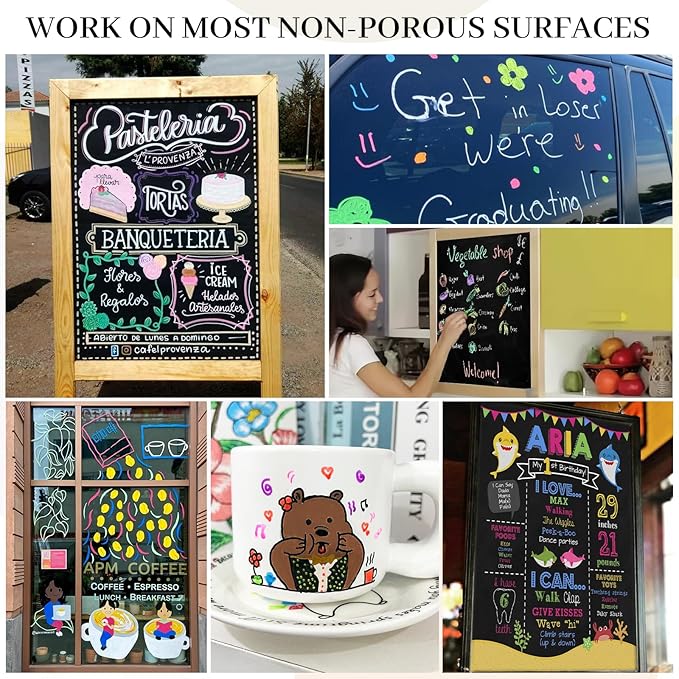 - Wipe off easily- Our chalk pens is water-based that can be easily wiped off on non-porous surfaces with only a damp cloth. Chalkboard markers fine tip will give you a clean surface, ideal for erasing on non-porous surfaces, such as chalkboards, acrylic panels, glass and ceramics. And fine point chalk markers will remaining permanent on porous surfaces