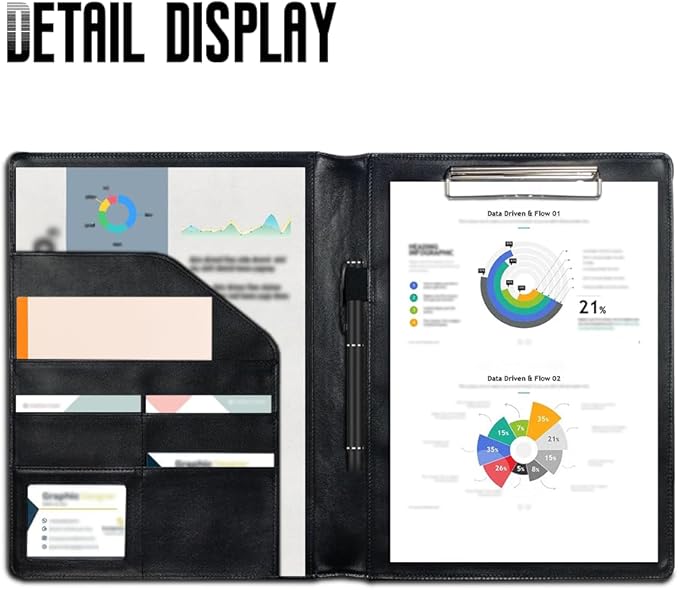 - [Multifunctional]: There is a binder on the right side; On the left, there are one large and one medium size pocket, three business card holders, and one ID window; There is also a pen holder in the middle. The multifunctional folder is convenient for storing business cards, ID cards, documents, receipts, and pens for daily use and business travel.