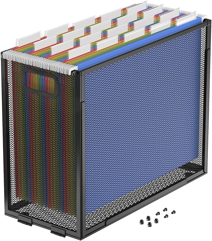 - [Material] The file folder organizer is made of steel and coated with paint. It is sturdy and durable, with smooth edges that won't hurt your hands. The bottom of the hanging file organizer has four soft silicone pads to protect your desktop.