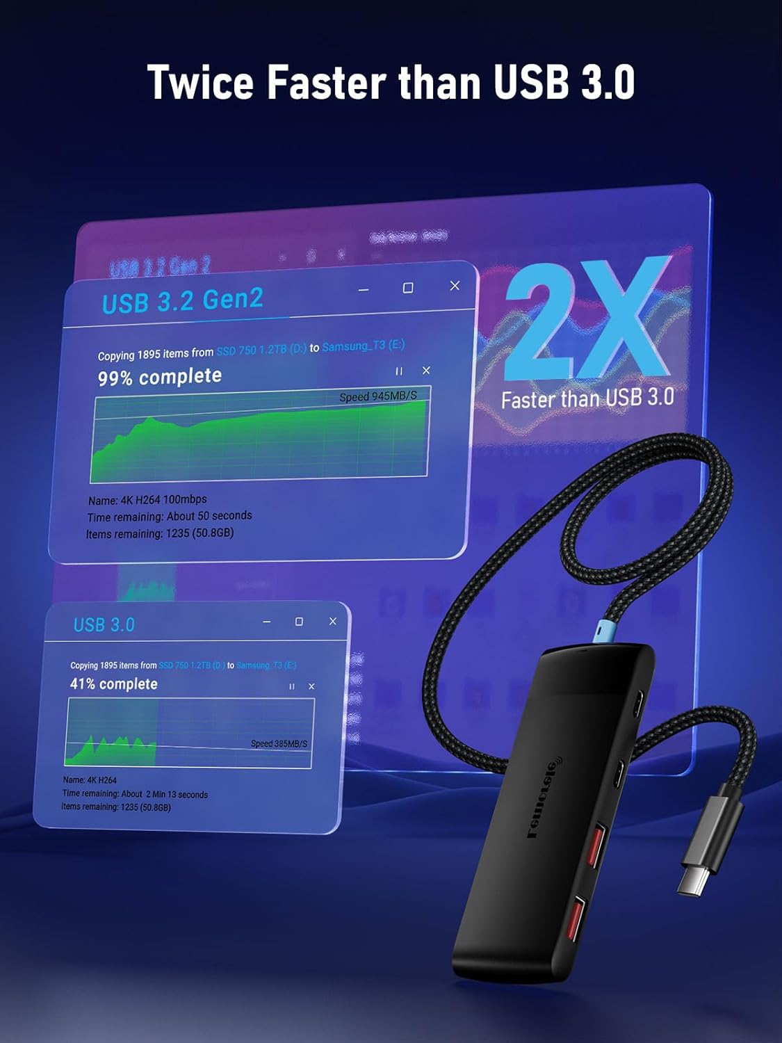 - [10Gbps High-Speed Data Transfer ]- This 5 in 1 USB C Hub With USB 3.2 Gen 2 and Data Transfer Speeds up to 10 Gbps (2X faster than USB 3.0), It's can Transfer or Backup your Data Quickly and Efficiently!(Note: please make sure your output and input devices all support 10Gbps)
