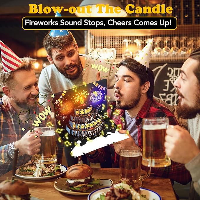 - 3D Pop-Up & Multisensory Experience: Opening reveals a vibrant 3D birthday cake with colorful LED fireworks, accompanied by "Happy Birthday" music and realistic firework sounds.