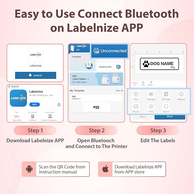 - 【Easy to Use】Seamlessly connect the bluetooth label maker to your IOS or Android phone via wireless Bluetooth. Step 1:for IOS users ,Download the "Labelnize" app from App Store. please note: for Android users, scan the QR code on the instruction manual and download the app from our official website.Step 2: Connect your P21 Bluetooth in the app.Step 3: Select a quick template from the user-friendly interface.Step 4: Start printing multiple labels with ease.