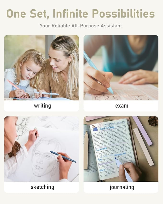 - All-in-One Bulk Pack: This pack includes 12 pastel colored highlighters, 6 adorable mechanical pencils, 5 black ink gel pens, 5 gel pen refills, a charming purple pencil pouch, 3 jelly erasers, 9 cap erasers, and 6 tubes of lead refills; It's the ultimate collection of multifunctional stationery essentials for office and school supplies