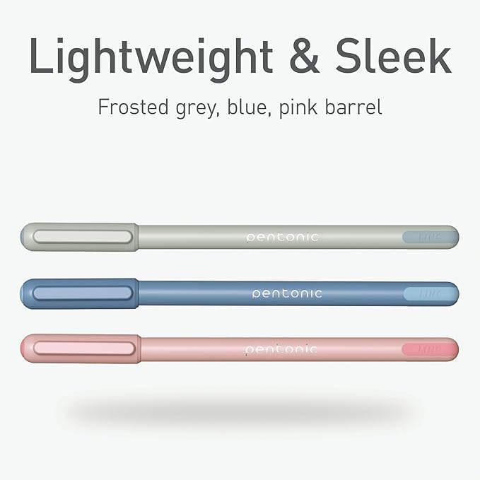 - These Pentonic ballpoint pens come in 15 count packs; they have assorted color barrels in frosted pale hues (gray, blue, pink) with red, black, and blue ink and 0.7 mm fine point tips