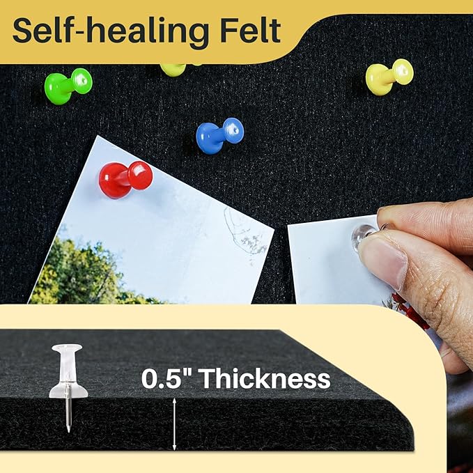 - High-Density Felt Board: Our cork bulletin board features a high-density 1/2 inch thick felt construction that holds up against multiple nailing without visible holes, and push pins will not go through your corkboards or break your wall, durability and longevity
