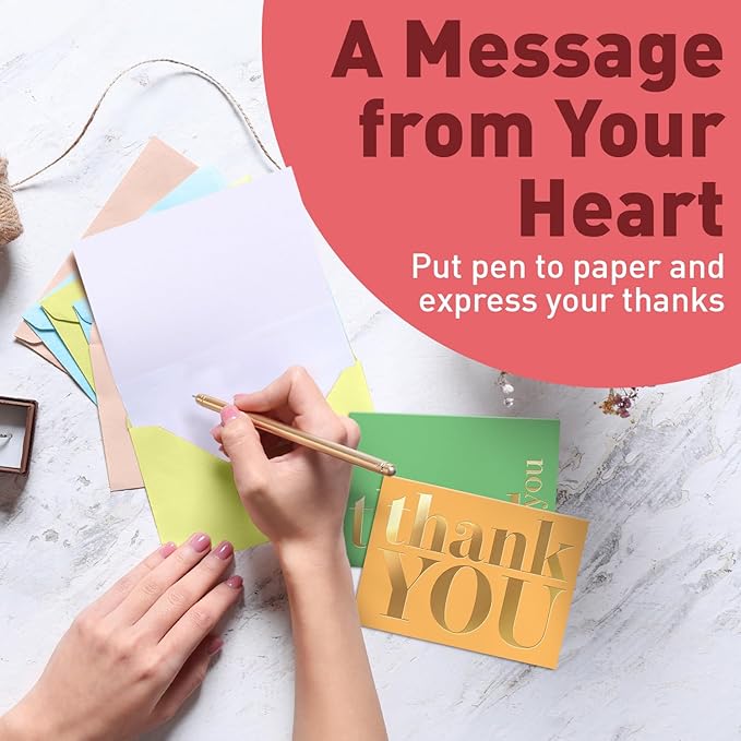 - Two-In-One Set — No more boring white envelopes. This thank you card pack of 24 introduces eye-catching pops of color from the moment they receive your thanks. These blank thank you cards with envelopes keep your stationery drawer fully-stocked for important events