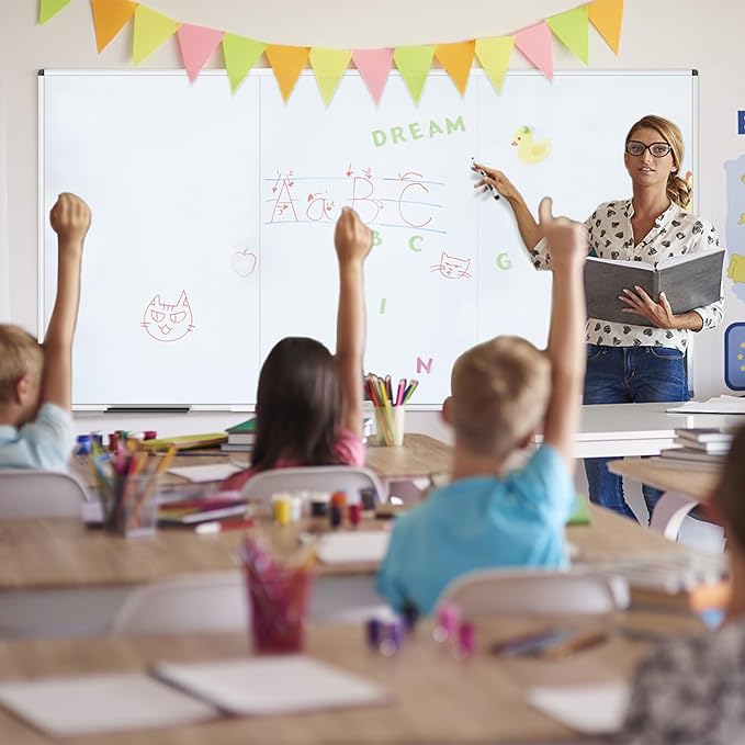 - [High Quality Details] Smooth & durable magnetic writing surface, easily dry wipe with all dry-erase markers. Folding design ensures that the whiteboard will not warp in transit. Anti-Scratch silver finished aluminium frame, ABS plastic corner with screw-fixing in corners, Detachable Marker Tray.