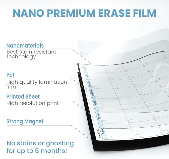 - NEW TECHNOLOGY, NEW EXPERIENCE - We use nano premium erase film on our products. Compared to the old PET film, the nano material will make your writings super easy to be wiped off even after you leave the writings on the planner for a very long time.