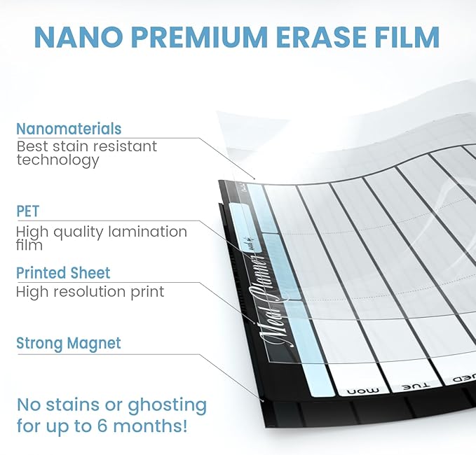 - Erases easily - Our calendars use premium nano erase film, making it incredibly easy to wipe off notes, even those that have been written for a long time. No residue, no fuss.