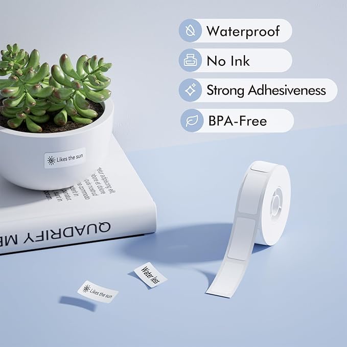 - Refill Labels - One roll of direct thermal labels with size 12 x 22 mm(0.47'' x 0.87''), 260 labels/roll, white label tape, self-adhesive sticker, black and white printouts