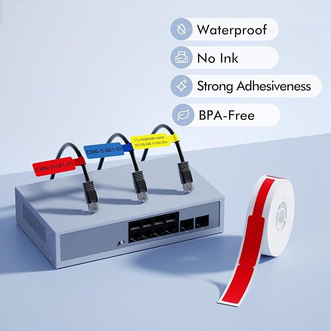 - Refill Labels - One roll of direct thermal labels with size 12.5 x 109mm (0.49'' x 4.29''), 65 labels/roll, red cable label tape, self-adhesive sticker, black and white printouts