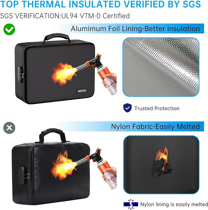 - Fireproof and Water-resistant: The multi-Layer file organizer is made of silicone coated material and aluminum foil which withstand the temperature up to 5200℉(double safe protection).Aluminum foil lining isn’t easily melt under high temperature after several tests. It has been passed by SGS TEST(UL94 VTM-0 Certified).The bag is fireproof and Water-resistant, which can effectively protect your important documents in a fire, flood, and wet weather. They will further keep your files intact.