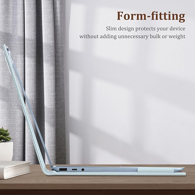 - Premium PU leather surface, soft interior lining, comfortable handing feeling, offers all round protection. Unique protective design allows operating your Surface Laptop freely without removing the case.