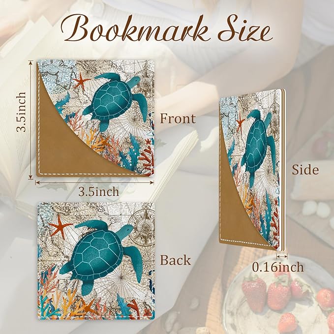 Cute Sea Turtle Corner Bookmarks, Funny Leather Book Accessories for Book Lovers, 3 Pcs Reading Book Page Markers for Women Men Student Teacher Girls Boys Kids Retirement Birthday Gifts