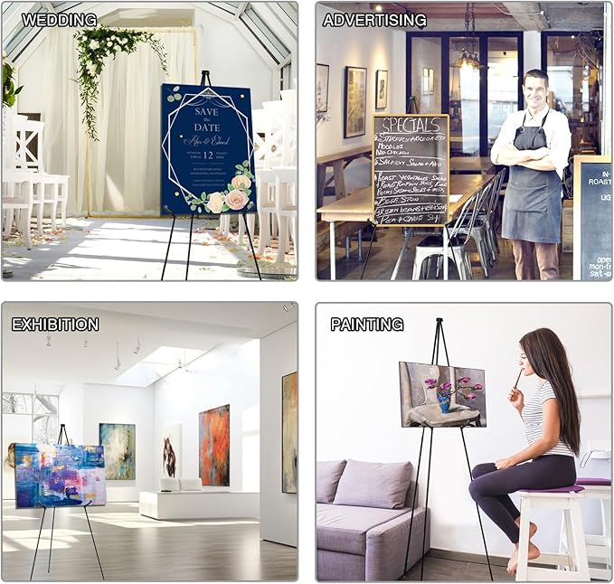 - 【Easy Install, Easy Take】The installation of poster stands for display is very convenient, you only need to take out sign stand from the bag, pinch the upper end, hold the sign holder stand and shake it gently, the easel for signs can be directly unfolded. Stretch each leg of the easel into place and keep the shape of the triangular easel to keep your easel stand for sign stable.