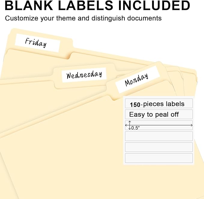 - PACKAGE INCLUDED: This bulk pack includes 150 letter size file folders (50 of each position) and 150 blank labels, idea for any home, office, or school project, providing you with plenty of storage space for all of your important documents