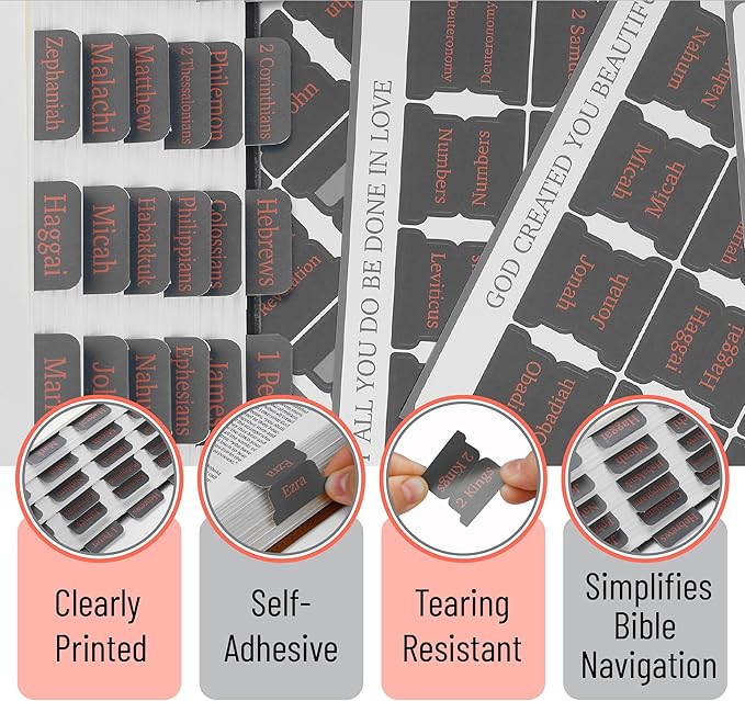 - With their large, clear font and bright printing, these Bible tabs offer a convenient organizational tool for those looking to engage in Bible study or journaling.