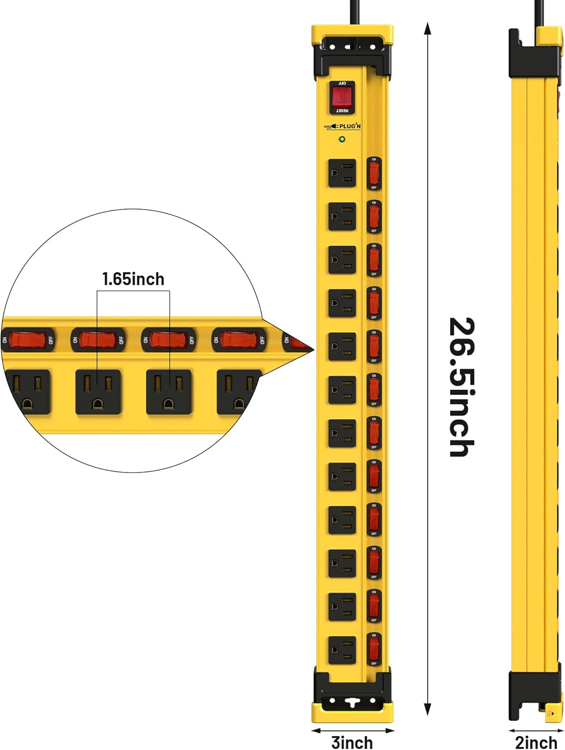 - Flat Plug and Power Cord--Long power cord and 1.69 inches wide spacing outlet and 45°right flat plug make this 12 outlet strip easy to use and move around;This mountable power strip made of extra-thick aluminum alloy housing with 14 gauge extension cord