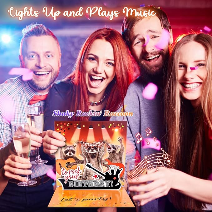 - 【Sound & Motion】When you open this birthday card, The disco lights flashing, raccoons shaking to music. Make your birthday is a truly memorable day! And, it can be played 2,000 times for 20 seconds each time, providing countless hours of laughter and entertainment, making it a cherished keepsake.