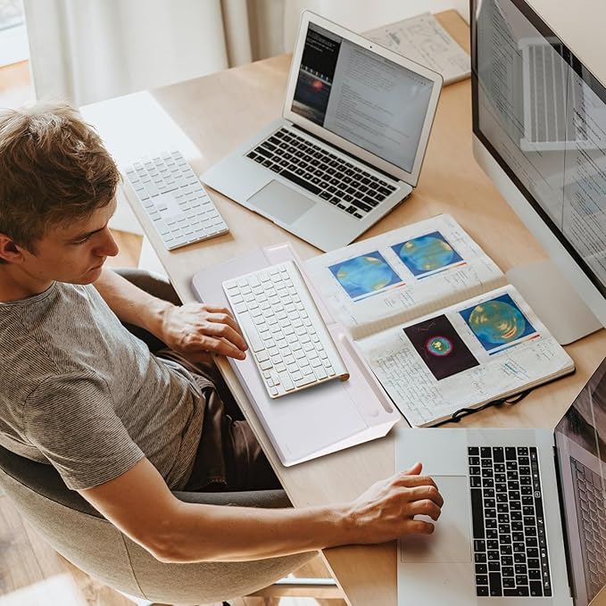 • PERFECT DESIGN: Maximize your work area. The desktop whiteboard is designed to sit perfectly between a keyboard and monitor and is slope angled for comfortable reading and writing, or typing when you are using it as a keyboard stand.
