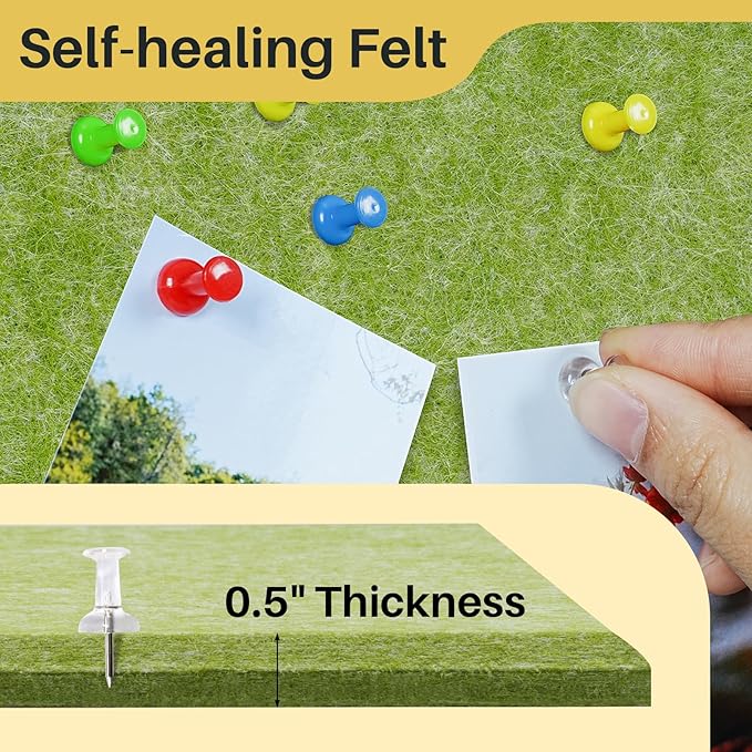 - High-Density Felt Board: Our cork bulletin board features a high-density 1/2 inch thick felt construction that holds up against multiple nailing without visible holes, and push pins will not go through your corkboards or break your wall, durability and longevity