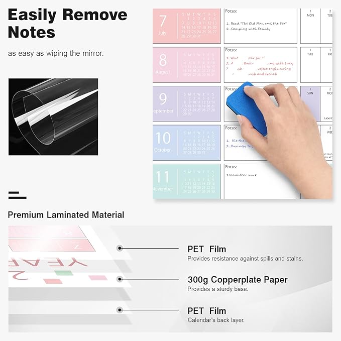 - ✨ Dry Erase Wall Calendar : is made of PET Film and 300 grams Copperplate Paper, providing a durable surface that resists scratches and smudges, while the sturdy Copperplate Paper backing keeps it in place without curling.