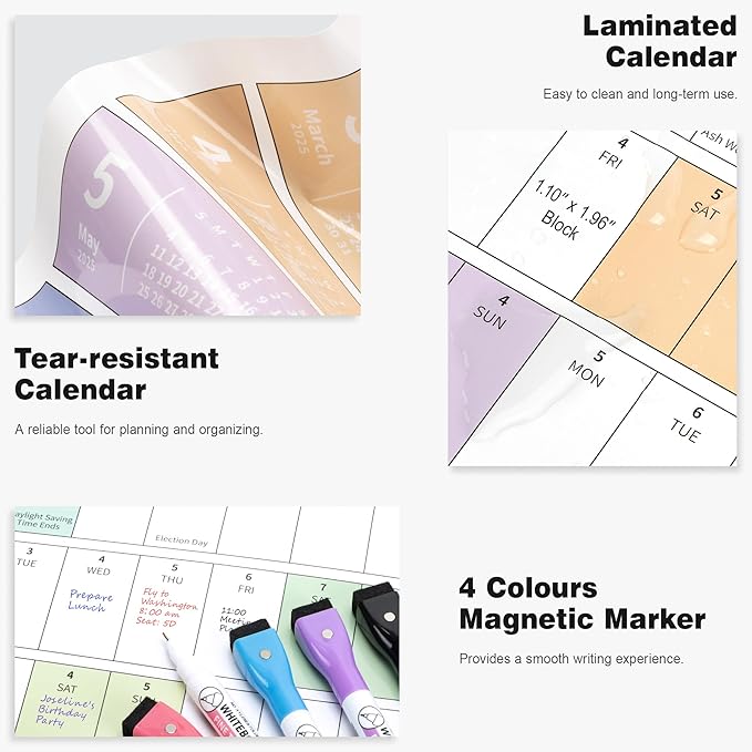 - ✨ Laminated Calendar with Dates: Waterproof wall calendar comes with a mini eraser, four dry-erase markers, 10 push pins, and 10 transparent round stickers. 12 months calendar covers the time range from July 2024 to June 2025, making it perfect for long-term use.
