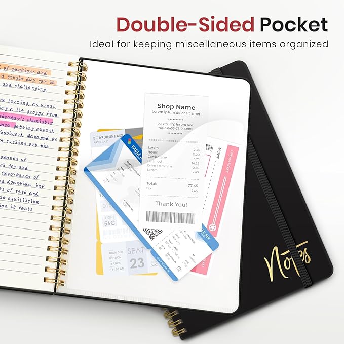 - Streamlined and Practical Design: Featuring 140 lined pages and a 6-page blank table of contents, our notebook provides generous room for note-taking and effortless referencing. An inner pocket safeguards miscellaneous items, while an elastic closure band ensures the notebook remains securely closed when not in use.