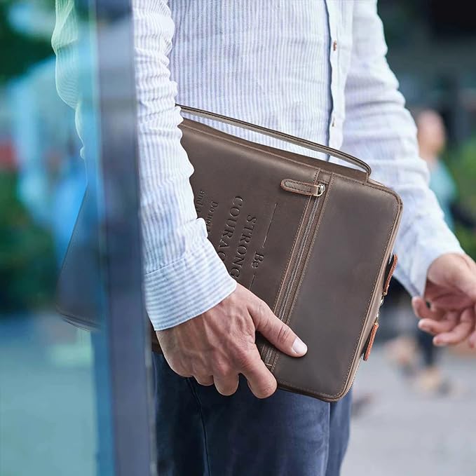 Polare Full Grain Leather Bible Cover Church Bag Bible Protective Book Holder Carrying Case Folder Organizer Portfolio with YKK Zippers, Dark Brown(Strong & Courageous)