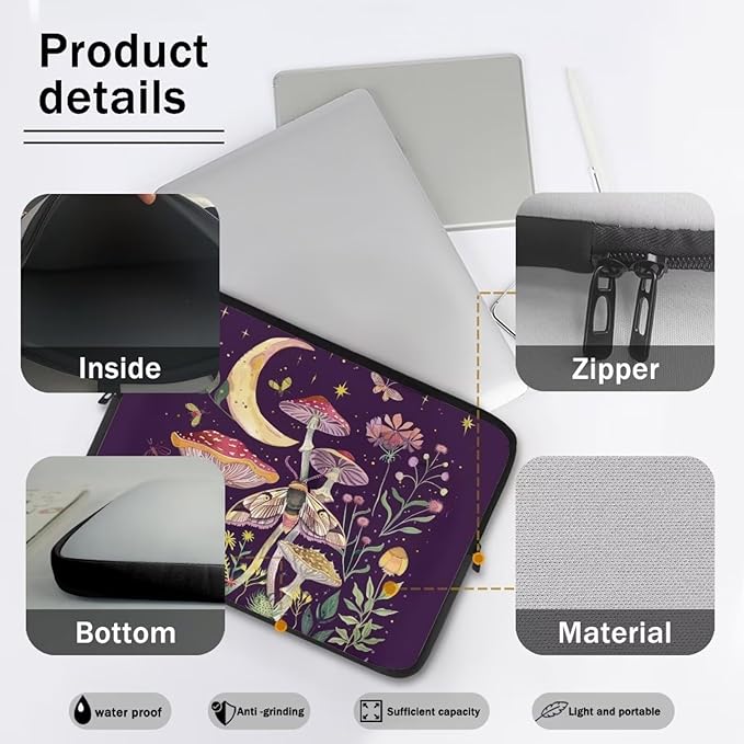 Mushroom Laptop Protective Sleeve for Girls Boys 13 inch Laptop Covers with Large Capacity Lap Top Case Lightweight Computer Sleeve Bag Suitable Gifts for Holidays Tablet Bag Moon