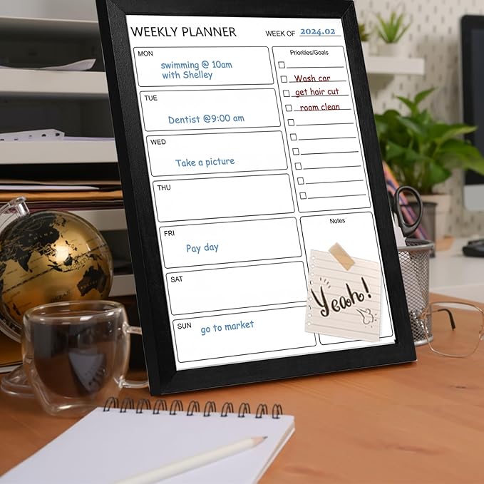 Dry Erase White Board Weekly Calendar Board, Magnetic Whiteboard for Wall, 10.5“x14.5” Solid Wood Black Framed Message Board, Planner Board for Office, Home, School(Weekly-BB-BK-2737)