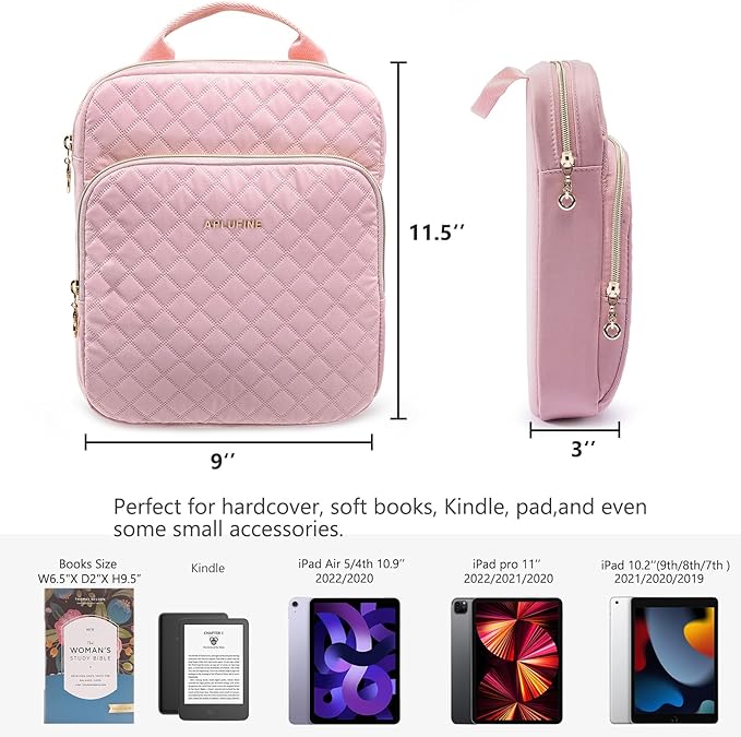 • Spacious Main Compartment - The size of the book pouch is 9 1/2"X11 1/2" which is roomy for hardcover, soft books, Kindle, and iPad.For your reference, it is large enough for a hardcover size of W6.5" X D2" X H9" Bible, and it still has room for a notebook journal.