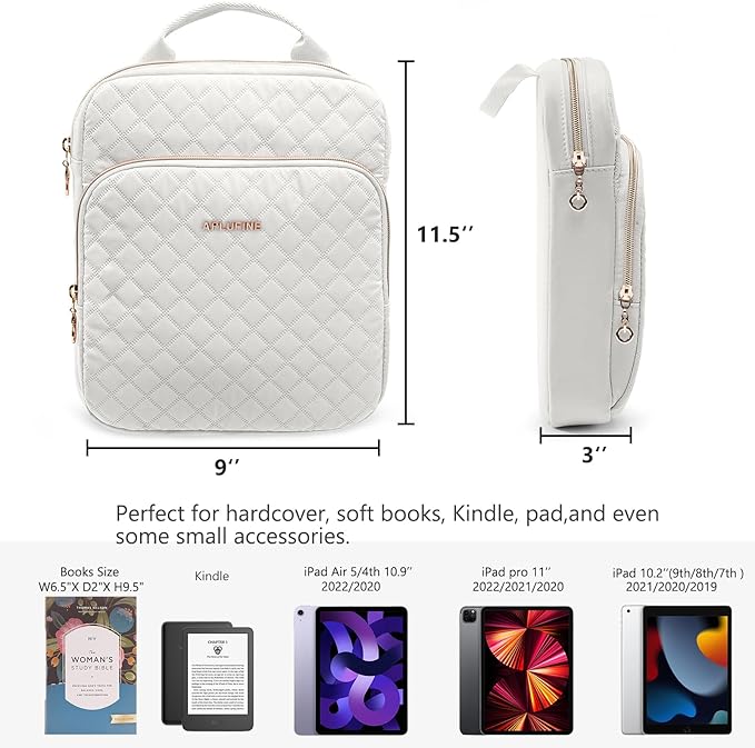 - Spacious Main Compartment - The size of the book pouch is 9 1/2"X11 1/2" which is roomy for hardcover, soft books, Kindle, and iPad.For your reference, it is large enough for a hardcover size of W6.5" X D2" X H9" Bible, and it still has room for a notebook journal.