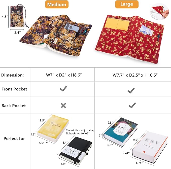 - SIZE - Comes 2 sizes for you to choose from. Medium: W7" X D2" XH10.5" which fits the book in the size of W5.5" X H8.5",AA Big Book (5.5”x8.5”) or 12 Steps & 12 Traditions or A5 Journal notebook; Large: W7.7" X D2.5" XH10.5" which is just for the woman's study bible or ESV bible in size of W6.75"XD2.24" XH9.5". The width of the book cover is adjustable. Please measure your books when ordering.