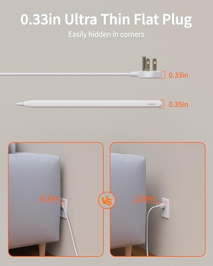 - [Ultra Thin Flat Plug & 5Ft Extension Cord]: With only a 0.33-inch ultra-thin plug, which is much slimmer than traditional plugs, so it's easier to access any wall socket and hide in the back of the sofa. And a 45° right-angle design will not block the bottom receptacle of your duplex wall outlet. The 5-foot flat cable is 50% thinner than the traditional power cords to run it under a rug or along walls without adding unsightly bulk or creating a trip hazard.