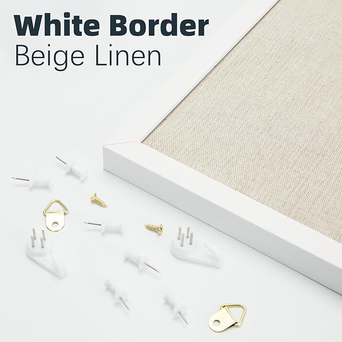 - 【Hassle-Free Mounting】 Easily hang the white frame linen cork board with the included accessories, white pins can help display photos, pictures, daily planner, notes, messages, memos, calendars, menus, reminders, etc. on the linen bulletin board.