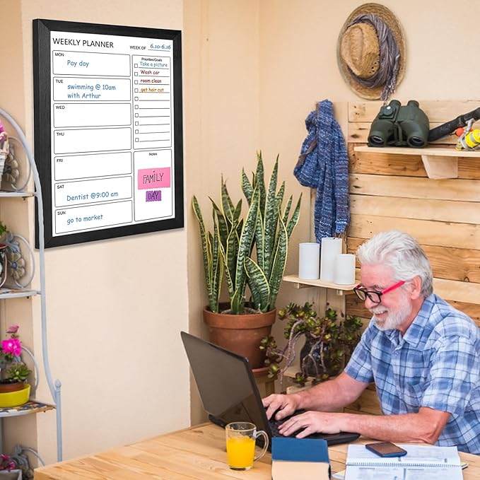 Dry Erase White Board Weekly Calendar Board, Magnetic Whiteboard for Wall,18“x24 Solid Wood Black Framed Message Board, Planner Board for Office, Home, School(Weekly-BB-BK-4560