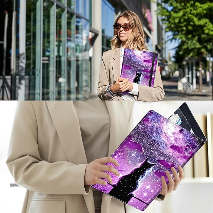 PU Leather Padfolio Clipboard Notepad with Pen Loop and Elastic Strap Interview/Resume Document Organizer for Business School Office,Hipster Cat Galaxy