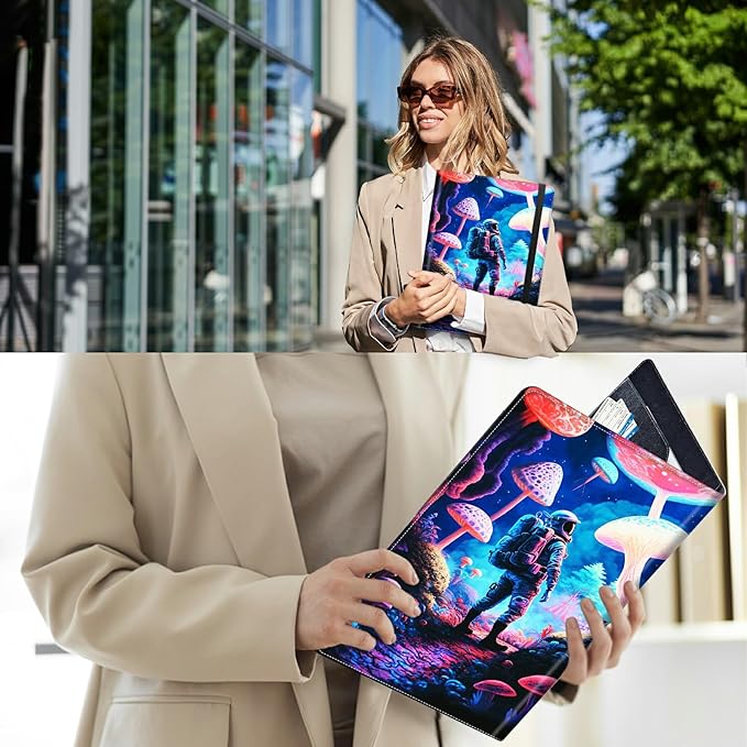 PU Leather Padfolio Folder Clipboard Portfolios Organizer Conference Document Organizer with Business Card Holder Storage Clipboard Writing Pad,Astronaut Under Mushroom