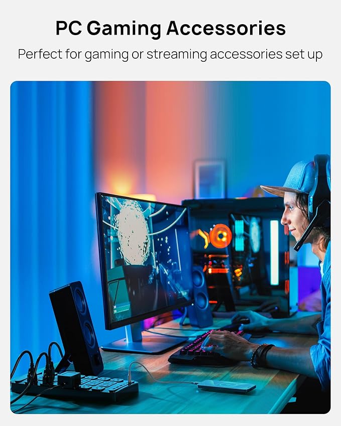 - 30-in-1 Power Strip with USB Ports: This versatile power strip features 24 AC outlets and 3 USB-A & 3 USB-C ports, with the USB-C ports supporting 20W fast charging. It supports 1875W/15A and universal voltages (100V-250V), and its spacious layout accommodates bulky adapters side by side, making it ideal for extensive setups like gaming stations, media centers, or home offices.