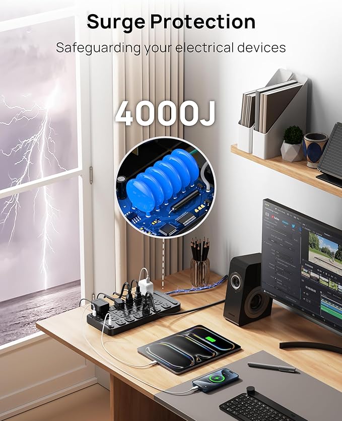 - 4000 Joules Surge Protection: Protect your valuable electronics from unexpected voltage spikes. This power strip offers robust surge protection to extend the lifespan of your devices and safeguard against potential damage. it has an on/off switch, which can be used to reset it if you overload it and it "pops" the security circuit.