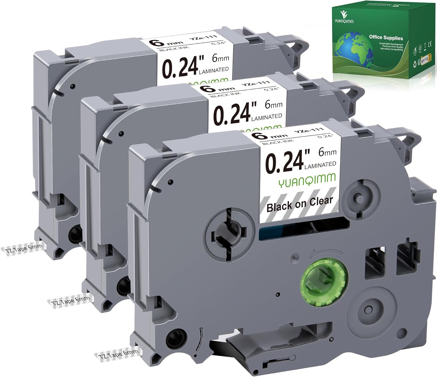 - Package included: 3-Pack Compatible with Brother PTouch TZe-111 TZ-111 TZe111 TZ111 6mm 0.23 Inch Black on Clear Label Maker tape