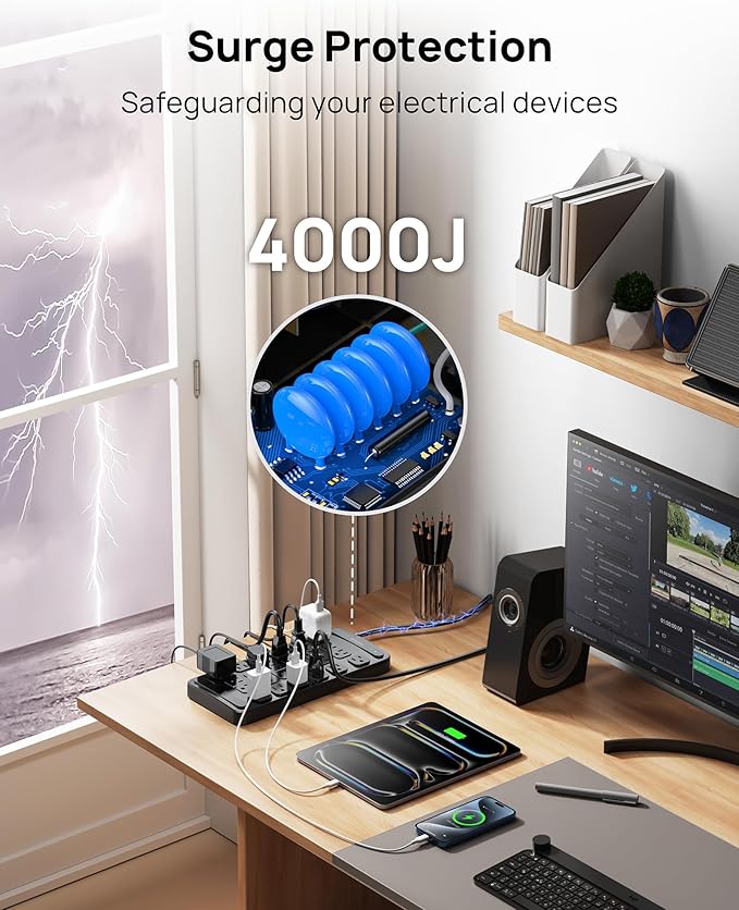 - 4000 Joules Surge Protection: Safeguard your valuable electronics with 4000 Joules of advanced surge protection. This power strip shields your devices from unexpected voltage spikes, extending their lifespan and preventing potential damage. An easy-to-use on/off switch allows for quick resets and added safety.