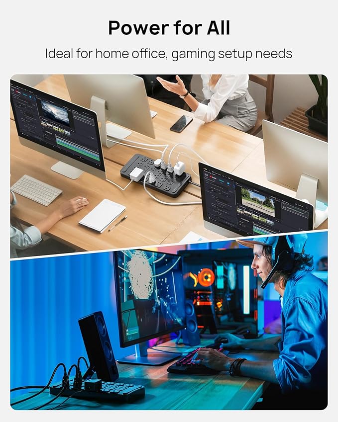 - 4000 Joules Surge Protection: Safeguard your valuable electronics with 4000 Joules of advanced surge protection. This power strip shields your devices from unexpected voltage spikes, extending their lifespan and preventing potential damage. An easy-to-use on/off switch allows for quick resets and added safety.